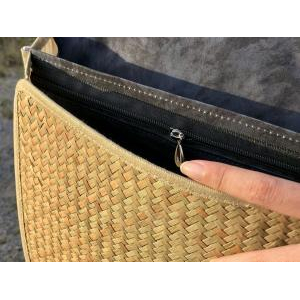 Ví cầm tay được làm từ cỏ bàng tự nhiên 100%, được đan thủ công bởi người dân địa phương